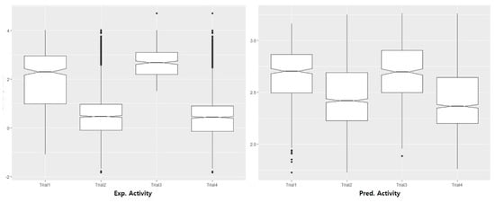 The external validation of the best model, APRRR215 was further conducted using 3rd data set (known D3 antagonists with structural diversity) from the ChEMBL database. Visualization of the validation was presented in ROC analysis to show how effectively the pharmacophore models distinguished between active and inactive compounds. Sensitivity (in other words, true positive rate, recall, hit rate) and specificity (in other words, true negative rate) are general indices to show the predictive power of a validated model. The ROC curve is a graphical representation of the false positive rate, (1–specificity) of x-axis and the true positive rate, sensitivity of y-axis for each of the possible cut-offs [36]. The accuracy of this test is measured by the AUC of the ROC curve. According to the general judgement on an AUC value of ROC curve (AUC of poor model = 0.5, AUC of a moderate accurate model = 0.5 to 0.7, and very accurate if the AUC > 0.9) [37], the AUC of two models in four trials could show moderate usefulness in global scaffolds: AUC of Trial 1 = 0.623 (≥4 out of 5 in APRRR215), AUC of Trial 2 = 0.801 (≥2 out of 5 in APRRR215), AUC of Trial 3 = 0.592 (≥5 out of 6 in AHPRRR104), and AUC of Trial 4 = 0.805 (≥2 out of 6 in AHPRRR104) (Figure 7). The constraint of pharmacophore feature matching in pharmacophore-based QSAR prediction made an effect on model performance so that it showed that our models are more sensitive to recognizing mismatched inactive but have the limited performance in delicate recognition of inactive having similar pharmacophore. In addition, the distribution of the experimental and predictive values was visually compared through box-and-whisker plot in Figure 8. Even though the model presented the limit to residual between experimental value and predicted value of active compounds, median values of two distributions could be well-matched and two distributions were identical after normalization.
