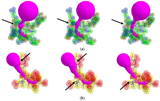 Tunnel shape changes with respect to different valid rotamer conformations, where arrows indicate changes of the tunnel shape: (a) tunnel Id. 138 of PDB Id. 1EA1 and (b) tunnel Id. 140 of PDB Id. 1DDZ.