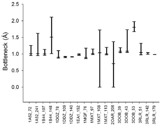 From the various tunnel shapes, we can obtain the bottleneck in each shape and the range of bottleneck changes by the minimum and maximum bottleneck values. In Figure 8, we present the minimum, maximum and mean of bottleneck values for each tunnel. The difference between the maximum and minimum values suggests dynamics of the tunnel bottleneck by rotating side chains in the tunnel. The low bottleneck value such as 0 implies that the tunnel could be completely blocked or the cavity is disappeared. If the side chain can be rotate freely, the mean value represents the average opening of the tunnel in a given time period suggesting the accessibility to the cavity through the tunnel. For the cases of tunnel Id. 140 of PDB Id. 1DDZ and tunnel Id. 179 of PDB Id. 3RLR, the maximum and minimum bottlenecks have little difference. The tunnels in these cases do not have big difference of shapes around the bottleneck.