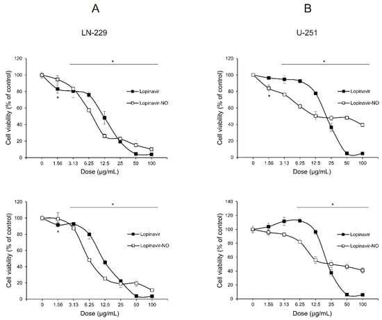 Lopinavir (Lopi) and Lopi-NO reduced the viability of glioblastoma (GBM) cell lines in a dose-dependent manner. LN-229 (A) and U-251 (B) cells were treated with a range of doses of Lopi and Lopi-NO for 48 h. Cell viability was determined by 3-(4,5-dimethylthiazol-2-yl)-2,5-diphenyltetrazolium bromide (MTT) (upper panel) and crystal violet (CV) assays (lower panel). The data are presented as percentage of control ± standard deviation (SD) from one representative out of three independent experiments. * p < 0.05 refers to untreated cultures.