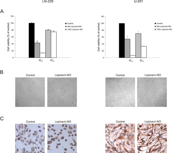 The GBM cell lines used in this study express similar panel of stem markers such as nestin, sex-determining region Y(SRY)–box 2 (Sox2), Musashi-1, and cluster of differentiation (CD)44 [38]. These cells exhibit higher migration and colonization abilities in comparison to other glioma cell lines. However, they differ in response to other environmental factors such as nutrition, indicating alteration in intracellular signature and ability to acquire specific phenotype [38]. While LN-229 can differentiate into neuronal cells, both neuronal and astrocytic differentiation was found in U-251 cell line. Cell maturation toward more specific phenotype is in general accompanied with the loss of dividing potential [14,15,40]. We found that withdrawal of Lopi-NO failed to restore cell viability, suggesting that it induced a permanent loss of proliferative properties. The proliferation inhibitory function is well-recognized mechanism of NO modified HIV-PIs that we previously observed with Saq-NO in melanoma, colon, prostate, and astrocytoma cells [14,33,40]. This property might be attributed to its potential of long-lasting interference with the activity of p70S6 kinase that is involved in the regulation of numerous proteins necessary for the cell division [14,32,33,36].