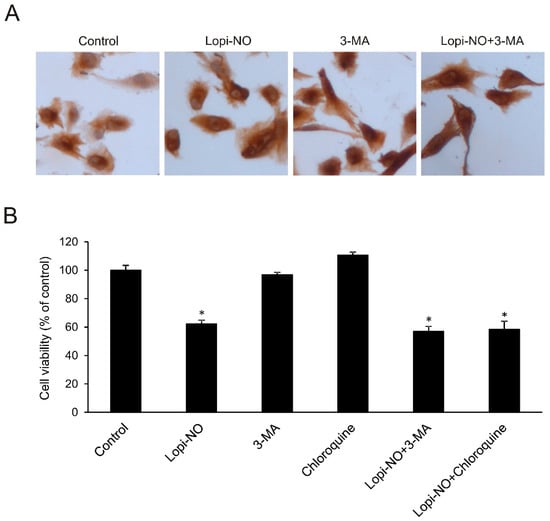 Autophagy is not relevant for differentiation of U-251 induced by Lopi-NO. Cells were treated with the IC50 value of Lopi-NO in the presence of autophagy inhibitor 3-methyladenine (3-MA) (1 mM) or chloroquine (20 μM) for 48 h and (A) GFAP expression by immunocytochemistry (magnification 320×) and (B) cellular viability by MTT test were estimated. * p < 0.05 refers to untreated cultures.