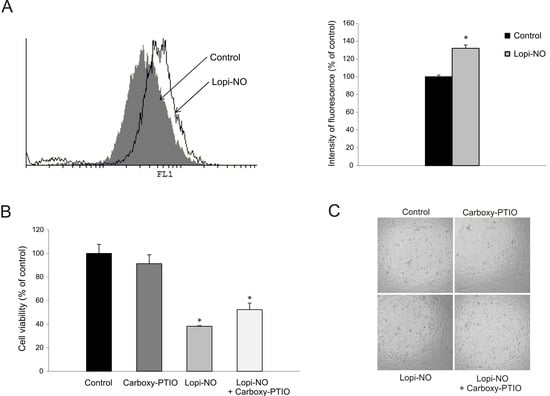 Since production of ROS is important for cell proliferation, differentiation, and cell death, the influence of Lopi-NO on their generation was estimated in this study. Similarly to Saq-NO [33], Lopi-NO triggered the production of ROS/RNS. In agreement with the ability of Lopi-NO to release NO, it was expected that this highly reactive molecule might have contributed to the augmented anticancer action of Lopi-NO vs. Lopi. The analysis of cellular viability in the presence of intracellular NO scavenger, carboxy-PTIO, that recovered cell viability confirmed this hypothesis.