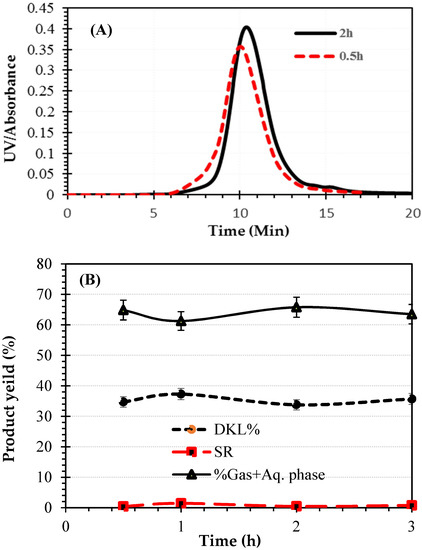To evaluate the effect of reaction time on DKL’s Mw and the product yields, black liquor and sodium hydroxide were heated to 250 °C to depolymerize the KL contained in the black liquor for various lengths of reaction time ranging from 0.5 h to 3 h, where the NaOH/lignin ratio was fixed at 0.3:1 (w/w) and the black liquor substrate contained 13 wt. % KL. Figure 3A illustrates the effects of reaction time on molecular weight distribution of DKLs for two different reaction times (0.5 h and 2 h). As seen in this figure, the GPC-UV signal shifted towards lower molecular weights in the case of the longer reaction time.