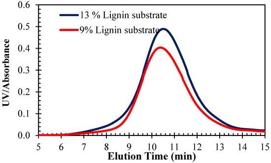 To evaluate the effects of initial KL concentration on the DKL’s Mw, black liquor and sodium hydroxide were heated to 250 °C for 2 h at a NaOH/lignin ratio of 0.3:1 (w/w) for both the original and the diluted black liquor substrates (13 wt. % and 9 wt. % KL concentrations). Mw distributions of the DKL products obtained from the black liquor samples with different initial KL concentrations are illustrated in Figure 4. As seen in this figure, the Mw declined when the initial KL concentration was reduced, suggesting that diluting black liquor with more water facilitated the hydrolytic splitting of ether linkages in KL during the depolymerization process at 250 °C, likely because water dilution enhanced the accessibility of the lignin molecules to the various reactants in black liquor. It should be noted here that diluting black liquor to too-low levels is not economically attractive since it would result in a higher energy consumption and reduced DKL recovery from black liquor.