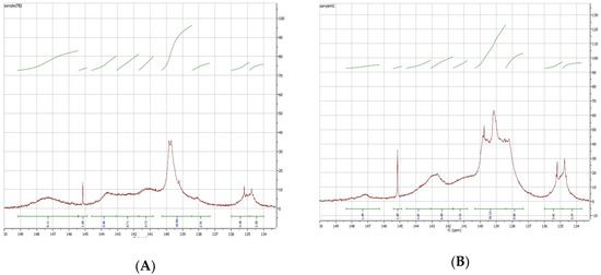 The hydroxyl group content of the lignin samples was measured using quantitative 31P NMR spectroscopy. The samples (30–40 mg) were dissolved in 500 μL of anhydrous pyridine and deuterated chloroform (1.6:1, v/v). This was followed by the addition of 50 μL of chromium(III) acetylacetonate (5.13 mg/mL in anhydrous pyridine and deuterated chloroform 1.6:1, v/v) used as the relaxation agent and 27.5 μL of cyclohexanol (21.07 mg/mL in anhydrous pyridine and deuterated chloroform 1.6:1, v/v) used as the internal standard. Finally, 100 μL of 2-chloro-4,4,5,5-tetramethyl-1,3,2-dioxaphospholane (TMDP) was added to the vial. The solution was thoroughly mixed and transferred to a sealed 5-mm NMR tube. All NMR experiments were carried out at 298 K on a Varian Inova 500 NMR Spectrometer operated at a frequency of 500.13 MHz and equipped with a 5 mm broadband inverse probe. 31P NMR spectra were recorded with 32,768 data points and a spectral width of 60,606.06 Hz, with a relaxation delay of 5 s and 512 scans. All chemical shifts are reported relative to the reference compounds of TDMP with cyclohexanol, which produces a sharp signal at 145.15 ppm referenced from the water signal (132.2 ppm) for the phosphitylating reagent [28].