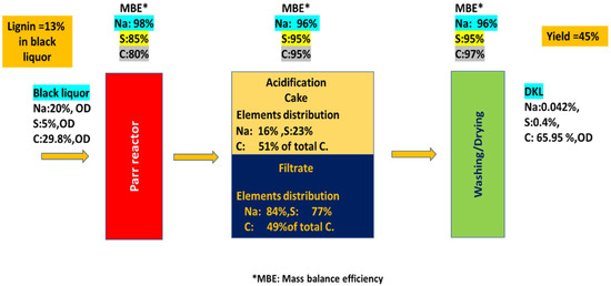 Schematic diagram illustrating the main unit operations of the DKL lignin recovery process (treatment of diluted KBL (with 9 wt. % KL) at 250 °C for 2 h, with 5% of methanol co-solvent in the presence of NaOH/lignin ≈ 0.3 (w/w)) along with the results obtained for elemental mass balance across all three unit operations.