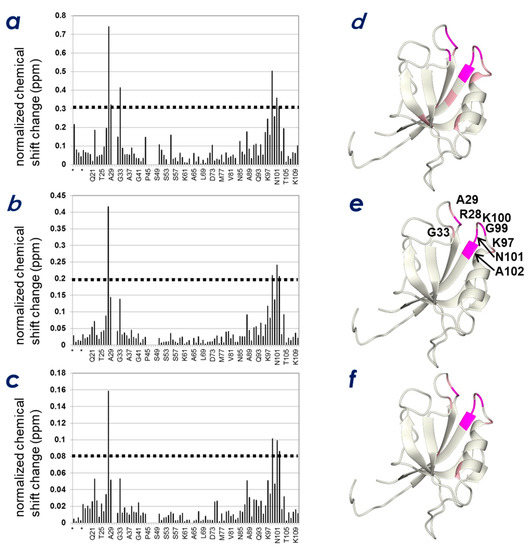 Identification of key residues of the mouse ZO-1(PDZ1) domain responsible for the interaction with inositol phosphate derivatives. Normalized chemical shift changes (a–c) and these changes mapped to the structure (d–f) upon addition of 5 molar equivalence of phytic acid (InsP6) (a,d), inositol-(1,4,5)-triphosphate, (b,e) and inositol-(1,4)-bisphosphate, (c,f). Resonances representing residues with larger chemical shift changes than the threshold values are mapped onto the ribbon model of mouse ZO-1(PDZ1) (PDB: 2rrm). The threshold values are indicated by dashed lines in the graphs. The residues at the interface are displayed in the figure.