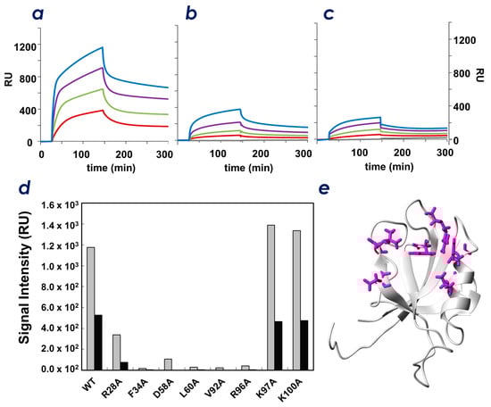 We then aimed to identify the key residues of ZO-1(PDZ1) that recognize CLD by single amino acid substitutions. From our PDZ-CLD complex model structure, we selected residues Arg28, Phe34, Asp58, Leu60, Val92, and Arg96. Residues Lys97 and Lys100 were mutated as negative controls (i.e., these two residues are not considered to be involved in ligand recognition by the domain). For the Ala-substituted mutants, the CLD-3-binding activity by SPR analysis was performed. A remarkable decrease of CLD binding activity for the Ala-substituted mutants Phe34, Asp58, Leu60, Val92, and Arg96 was observed, and a moderate decrease in binding affinity was observed for the Arg28 mutation (Figure 6a,b). Thus, Phe34, Asp58, Leu60, Val92, and Arg96 are key residues involved in binding CLD C-terminal peptides, probably through interaction with residues Val(0), Tyr(−1), and Asp(−2) at the CLD-3 C-terminus. The results indicate that the structural model of the ZO-1(PDZ1)-CLD-3 peptide complex was helpful in identifying the mechanism of molecular recognition at the residue level.