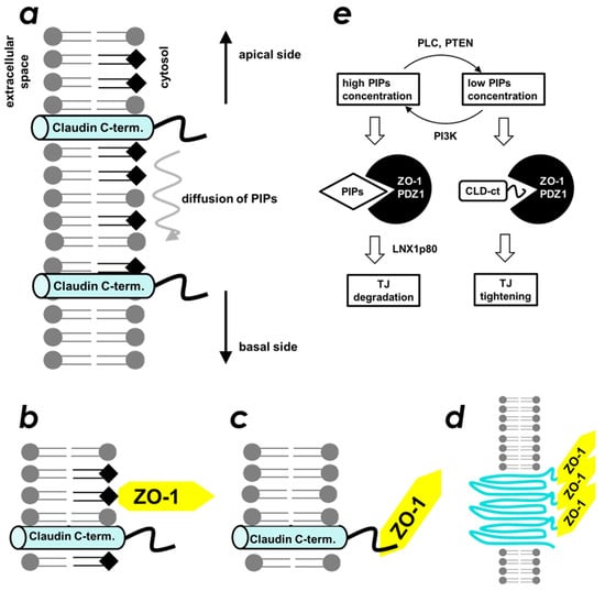 Our proposed mechanism is partly supported by several lines of evidence found in the literature. First, in the 1990s, the relationship between activation of phospholipase C (PLC) and TJ tightening (an increase in paracellular electric resistance) in Madin-Darby canine kidney cells was reported [35,36]. Later, inhibition of either PLCγ [37] or PLCβ [38] was reported to increase TJ permeability. Accordingly, phosphatidylinositol-3-kinase (PI3K) was also reported to regulate TJ functions. For example, in PI3Kγ-KO mice, the permeability of the blood–brain barrier (BBB) was reduced significantly [39], whereas activation of PI3K by perfluorooctane sulfonate increased the BBB permeability [40]. The results suggested that the cellular concentration of PIPs regulates TJ function. For example, enrichment of PIPs (caused by downregulation of PLC or activation of PI3K) resulted in weakened TJ function, whereas a decrease in PIPs concentration (caused by activation of PLC or inhibition of PI3K) resulted in TJ tightening (Figure 6e). We also partially succeeded in observing a similar phenomenon using a cultured MDCK II cell system. In brief, chemical inhibition of PI3K by LY-294,002 resulted in increased localization of CLD 7 at the apicolateral membrane in a dose dependent manner (Supplementary Figure S5). In addition, the connection between the PIP-specific phosphatase PTEN and the epithelial-mesenchymal transition (EMT) has been widely studied as follows. Loss or down-regulation of PTEN gene expression promotes EMT [41,42,43]. Conversely, up-regulation of PTEN via antagonizing miR-21 reverses EMT [44]. Although there are many signaling steps between PTEN and EMT, the simplest mechanism that cannot be ruled out would involve an increase in PIP concentration, which may directly loosen the TJ (Figure 7e).
