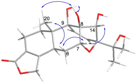 NOESY analysis was used to deduce the relative configuration of 1 (Figure 3). Orientations were confirmed by the NOE correlations of H3-20/8-OH, 9-OH and H-6β; of H-6β /H-7/H-14. Finally, the proposed structure of 1 was confirmed by an X-ray crystallography analysis using anomalous scattering of Cu Kα radiation (Figure 4). Accordingly, the absolute configuration of 5S, 7R, 8S, 9R, 10S, 13S, and 14S was established based on the value of the Flack absolute structure parameter—0.02(11).