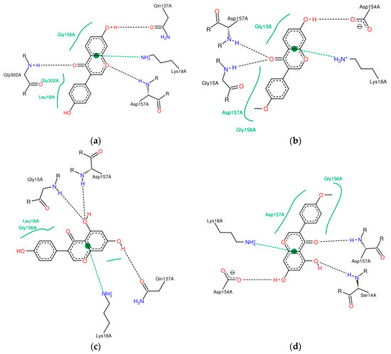Daidzein and genistein differ in the presence of the hydroxyl group at C5 in the latter molecule. At the hydroxyl group in the genistein molecule, two hydrogen bonds with Gly15 and Asp157 occurred. Xiao [18] noted that an additional hydroxyl group in the C-ring of flavonoids may attenuate protein affinity, especially when it results from hydrophobic interactions. In our studies, an increase in affinity was observed with the occurrence of an additional hydroxyl group in the A-ring.