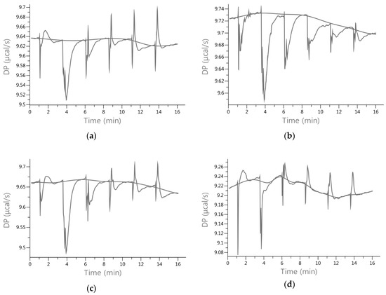 ITC raw data from the titration of actin with red clover sprout extracts cultivated under (a) white light for 10 days; (b) UVA 3 for days; (c) UVA for 8 days; (d) UVB for 11 days.