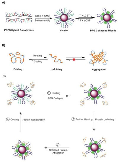 Schematic representation of (A) thermoresponsive poly(PEGMA-PPGMA-POSSMA) (PEPS) hybrid copolymer self-assembly in aqueous solution and (B) heat-induced protein denaturation process. Yellow and light blue spots represent the hydrophobic and hydrophilic sites of proteins, respectively. (C) Proposed working mechanism of the thermally denatured protein protection by thermoresponsive PEPS hybrid micelles. LCST, CMC and PPG represents for lower critical solution temperature, critical micelle concentration and poly(propylene glycol), respectively. Reprinted with permission from [67]. Copyright (2014) The Royal Society of Chemistry.