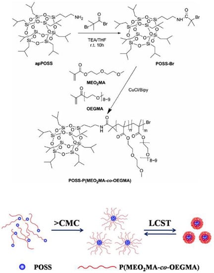 Synthesis of thermoresponsive POSS–P(MEO2MA-co-OEGMA) and schematic self-assembly process of the POSS–P(MEO2MA-co-OEGMA) in water in response to temperature. Reprinted with permission from [105]. Copyright (2014) Springer Nature.