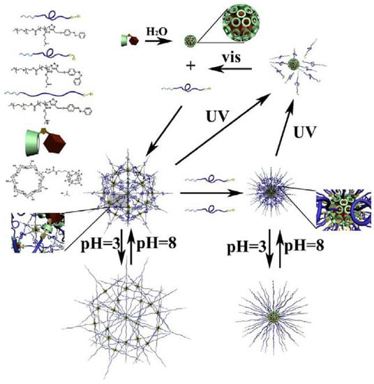 The optically sensitive micelles are normally triggered by photoresponsive chromospheres. A smart multi-stimuli-responsive copolymer (PEG-b-PDMAEMA-azo, PPA) of monocyclodextrin-substituted isobutyl POSS (mCPOSS) and azobenzene end-capped poly(ethylene glycol)-b-poly (2-(dimethylamino) ethyl methacrylate) was prepared (Figure 6) [106]. The mechanism of its micelle formation in aqueous solution started from the nanosphere formation of mCPOSS, self-assembled because of its amphipathic property. Then, the trans-azo end groups on PPA interacted with the cyclodextrin, followed by the supramolecular assembly between PPA and mCPOSS. The morphology, formation/dissociation, and size could be adjusted by the ratio of PPA and mCPOSS, visible and ultraviolet light, and pH, respectively.