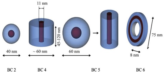 Aminopropylisobutyl POSS (ap-POSS–Br)-initiated polymerization of methylmethacrylate (MMA) and methacrylisobutyl POSS (MAPOSS) was reported to produce self-assembly into 150–300-nm core–shell micelles with ap-POSS/MA-POSS as the core and poly methylmethacrylate (PMMA) as the shell, or core–shell–crown micelles with poly methacrylisobutyl POSS (P(MA-POSS)) as the core, PMMA as the shell, and ap-POSS as the crown when P(MA-POSS) content was increased [107]. It was found that POSS is a powerful hydrophobic unit in the assembly of poly (acrylic acid)-co-poly(acrylate-POSS) [108]. With low POSS ratios in the copolymers, i.e., 40 to 110 acrylic acid repeat units to one POSS, the copolymers could self-assemble to form nanoaggregates. Increasing the volume fraction of insoluble blocks could result in morphological transformations (Figure 7) [109]. The solvent effect mentioned showed that the copolymer POSS-b-PDMAEMA-b-PMMA self-assembled into polymeric micelles with different shapes such as spherical, rod, and necklace morphologies in various solutions [110]. In specific solvents, P(MMA-co-GMA)-b-PMAPOSS could form ordered micelle-like structures such as spherical, cylindrical, or vesicle-like morphologies by tuning the copolymer and mixed solvent compositions [109]. Controlling the length of the particular blocks also makes it possible to tune the micellar structures. Copolymers with short-range ordering generally lead to spherical micelles or cylindrical and lamellar aggregates.