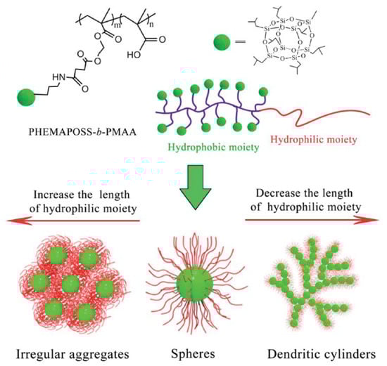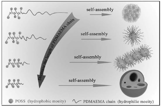 Self-assembly of poly(2-hydroxyethyl methacrylate-POSS)-b-(poly(methyl methacrylate)) (PHEMAPOSS-b-PDMAEMA) in water with the decreasing length of the hydrophilic PDMAEMA chain. Reprinted with permission from [114]. Copyright (2014) John Wiley and Sons.