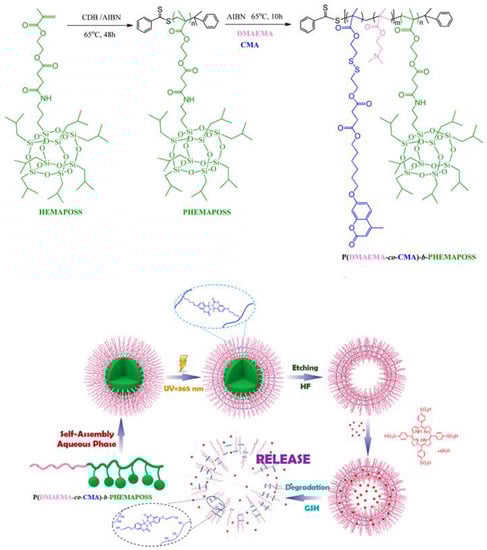 A novel amphiphilic diblock copolymer, poly(methacrylate monomer based on polyhedral oligomeric silsesquioxane) block poly(dimethylamino ethyl methacrylate-cocoumarin methacrylate) PHEMAPOSS-b-P(DMAEMA-co-CMA), was prepared for photodynamic therapy (PDT) application via RAFT polymerization (Figure 14) [127]. Photodimerization of coumarin led to the formation of micelles with POSS cores and stimuli-responsive shells, and then hollow polymeric capsules could be finally obtained via etching the POSS core (Figure 14). The hollow polymeric capsules are multi-stimuli-responsive to redox potential and pH and could be utilized in the encapsulation and release of tetraphenylporphyrin tetrasulfonic acid hydrate (TPPS). The capsule showed a relatively low TPPS release at pH = 7.4. However, a burst release of TPPS was found in the presence of 10 mM glutathione (GSH) at pH = 5.5. TPPS-loaded polymeric capsules also demonstrated low dark toxicity toward MCF-7 cells. Due to the size effect of POSS, it could be an ideal sacrificial template for the encapsulation of drug molecules.