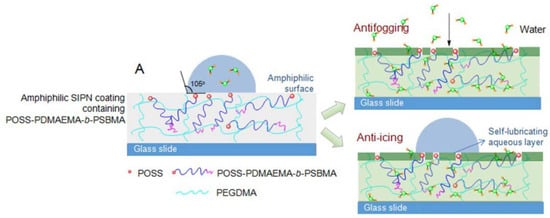 Li and coworkers developed highly transparent antifogging/anti-icing coatings with POSS–poly(2-(dimethylamino)ethyl methacrylate)-block-poly(sulfobetaine methacrylate) (POSS-PDMAEMA-b-PSBMA) with a small amount of ethylene glycol dimethacrylate (EGDMA) (Figure 16) [132]. The POSS clusters aggregated and dispersed well within the polymer matrix with the size of 10–80 nm. With the hygroscopicity of both PDMAEMA and PSBMA blocks with polymerization of EGDMA and the hydrophobicity of POSS, the copolymers exhibited excellent antifogging properties. In addition, the hygroscopic coatings could manipulate water molecules well-dispersed into the hydrophilic matrix via hydrogen-bonding interactions. Interestingly, the amphiphilic coatings exhibited the anti-icing ability with a freezing delay time of more than 2 min at −15 °C, owing to the aggregation tendency of hydrophobic POSS and the self-lubricating aqueous layer generated by the nonfreezable water on the surface.