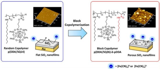 - Ishizaki, Y.; Yamamoto, S.; Miyashita, T.; Mitsuishi, M. Synthesis and Porous SiO2 Nanofilm Formation of the Silsesquioxane-Containing Amphiphilic Block Copolymer. Langmuir 2018, 34, 8007–8014. [Google Scholar] [CrossRef] [PubMed]