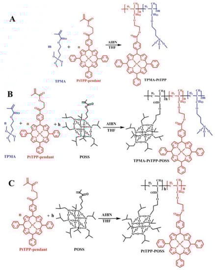 Syntheses of the oxygen-sensitive copolymers of TPMA–PtTPP (A), TPMA–PtTPP–POSS (B), and PtTPP–POSS (C) copolymers. Reprinted with permission from [139]. Copyright (2017) The Royal Society of Chemistry.