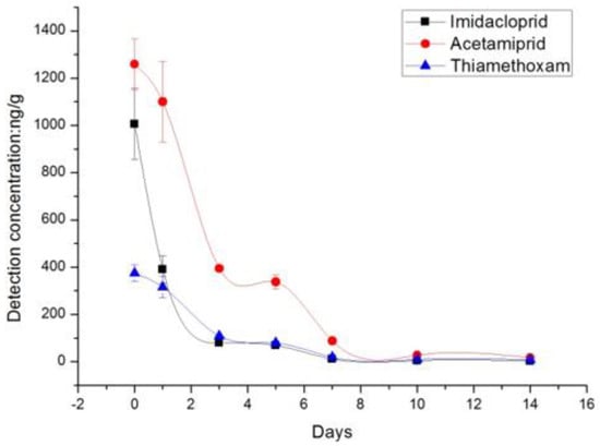As shown in Table 1, the average initial residue deposits of the neonicotinoids were 370.0, 1006.0, and 1259.0 ng/g from treatments with thiamethoxam, imidacloprid, and acetamiprid at the recommended doses, respectively. On day 1 after treatment, 12.7–15.9% of the neonicotinoids residues had dissipated from the rape flower, which increased to 93.1–95.0% by day 7, with the exception of imidacloprid, which showed substantial degradation (61.2%) on day 1. Imidacloprid residues dissipated fast in the initial stages. On day 5 after application, more than 70% of the residues had dissipated from both treatments, which increased to about 95% by day 10. On day 10, the residue levels of imidacloprid were below the LOQ. The dissipation trend of the neonicotinoids is described in Figure 1.