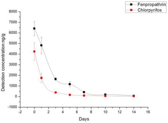 As shown in Table 2, the average initial residue deposits of chlorpyrifos and fenpropathrin were 4249 ng/g and 6409 ng/g, respectively, after treatment at the recommended doses. On day 1 after treatment, 24.7% of fenpropathrin residues had dissipated from the rape flower, which increased to 93.6% by day 7. In contrast, 58.7% of chlorpyrifos residues had dissipated from the rape flower by day 1, which increased to 90.9% by day 3. On day 14, the residue levels of chlorpyrifos and fenpropathrin were 38.7 ng/g and 58.7 ng/g. The dissipation trends of chlorpyrifos and fenpropathrin are described in Figure 2, showing that the degradation rate of chlorpyrifos was much faster than that of fenpropathrin.