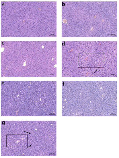Histopathological examination of the livers of mice treated with the control (a); CDAE 2.3 g/kg (b); CDAE 4.6 g/kg (c); CDAE 9.2 g/kg (d); CDEE 2.3 g/kg (e); CDEE 4.6 g/kg (f); and CDEE 9.2 g/kg (g) for 28 days. (HE, 300×).