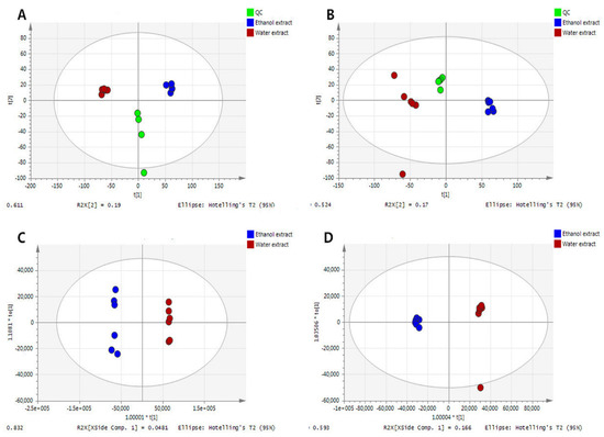 Partial Least Squares Discriminant Analysis (PLS-DA) diagram of CDAE and CDEE. (A) Positive ions (PCA); (B) Negative ions (PCA); (C) Positive ions (PLS-DA); (D) Negative ions (PLS-DA).