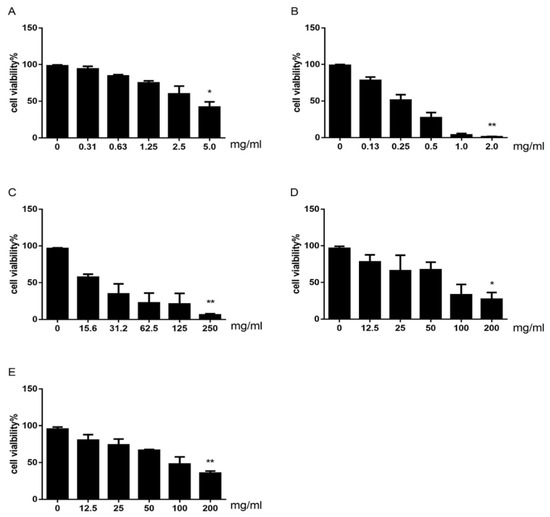 Cell viability of HepG2 cells treated with CDAE (A); CDEE (B); dictamnine (C); obakunone (D); and fraxinellone (E) for 48 h, as estimated by the CCK-8 assay (Values are expressed as means ± SDs, * p < 0.05, ** p < 0.01 compared with the control group. n = 3).