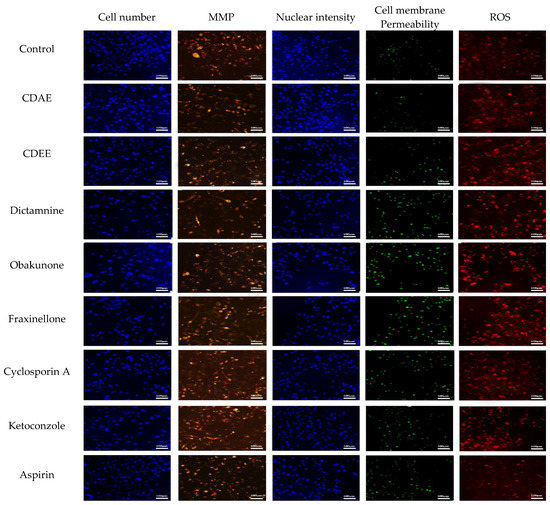 In this assay, we used five parameters to determine the drug-induced liver toxicity: cell number, nuclear intensity, MMP, cell membrane permeability, and concentration of ROS. The exponentially-growing HepG2 cells were seeded into 384-well plates at a density of 1 × 105 cells/mL in a final volume of 20 µL medium for 24 h. Then, the cells were treated with varying doses of CDAE or CDEE. After 48 h incubation, the cells were applied to a fluorescent dye cocktail, which contained SYTOX Green Nucleic Acid Stain for Cell Membrane Permeability, Cell ROX Deep Red Reagent for ROS, TMRM for MMP, and Hoechst 33342 to determine the cell number or nuclear intensity. The excitation and emission wavelengths were 346 nm and 460 nm, respectively. The signal of the cell membrane permeability dye was acquired with 504 nm excitation and 523 nm emission wavelengths. For the ROS signal collection, the excitation and emission wavelengths used were 644 nm and 655 nm, respectively. The mitochondrial signal (MMP) was detected at 540 nm excitation and 580 nm emission wavelengths. The images were observed and examined using 10 × objective. The concentrations of CDAE and CDEE were the same as that of CCK-8 assay. The positive control compounds were cyclosporin A and ketoconazole, and the negative control compound was aspirin. DMSO (0.5%) was used as Vehicle control.