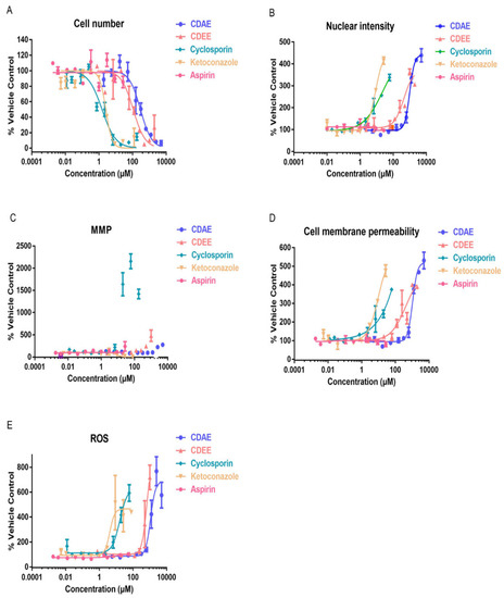 Estimation of drug-induced liver toxicity of CDAE and CDEE using a high content imaging assay. (A) Cell number; (B) nuclear intensity; (C) mitochondria membrane potential (MMP); (D) cell membrane permeability; and (E) reactive oxygen species (ROS).