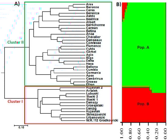 UPGMA phylogenetic tree and population structure (at K = 2) of the 40 barley accessions based on AFLP data; (A) Cluster I included the Eastern European genotypes (Poland), while Cluster II represents the Western European genotypes (France and the Netherlands). (B) Structure analysis showing that the 40 barely accessions are assigned to two populations (Pop. A represented in green comprised the Western European genotypes, while Pop. B represented in red included the Eastern European genotypes).