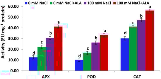 APX, POD and CAT activities in Slaski 2 cultivar leaves under salt and/or ALA (7 ppm) effects. Values represent means ± SE (n = 4). Different letters show significant difference among treatments (p ≤ 0.05).