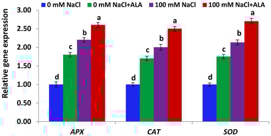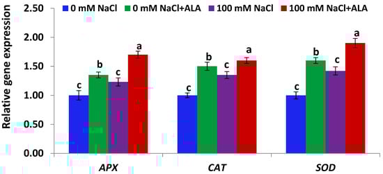 Expression level of antioxidant genes in Slaski 2 cultivar leaves under salt and/or ALA (7 ppm) effects. Values represent means ± SE (n = 4). Different letters show significant difference among treatments (p ≤ 0.05).