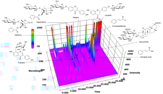 Eight reference standards (albiflorin, cinnamaldehyde, cinnamic acid, daidzin, glycyrrhizin, liquiritin, paeoniflorin, and puerarin) were purchased from Wako (Osaka, Japan) and the purities of these reference standards were greater than 98.0%, as evaluated via high-performance liquid chromatography (HPLC). The HPLC-grade reagents, methanol, acetonitrile, and water were obtained from J.T. Baker (Phillipsburg, NJ, USA). Analytical-grade glacial acetic acid was procured from Junsei (Tokyo, Japan).