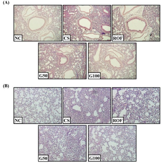 GGWE attenuate inflammatory cell infiltration in H&E staining. (A) Peribronchial region, (B) alveolar region. NC, non-treated mice; CS, CS and LPS exposure mice; ROF, roflumilast 10 mg/kg and CS and LPS exposure mice; G50, GGWE 50 mg/kg and CS and LPS exposure mice; G100, GGWE 100 mg/kg and CS and LPS exposure mice.
