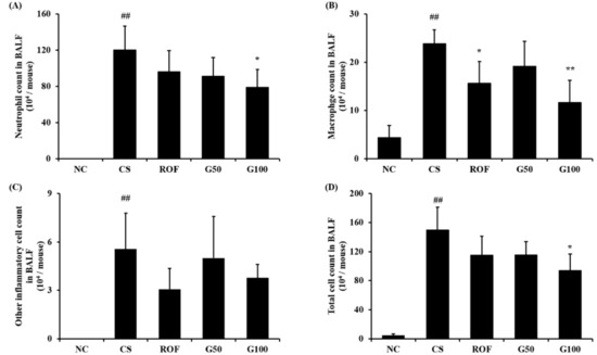 GGWE reduce inflammatory cell counts in bronchoalveolar lavage fluid (BALF). (A) number of neutrophils, (B) number of macrophages, (C) number of other cells and (D) number of total cells. NC, non-treated mice; CS, CS and LPS exposure mice; ROF, roflumilast 10 mg/kg and CS and LPS exposure mice; G50, GGWE 50 mg/kg and CS and LPS exposure mice; G100, GGWE 100 mg/kg and CS and LPS exposure mice. The values shown are the mean ± SD. ## p < 0.01 vs. NC; # p < 0.05 vs. NC; ** p < 0.01 vs. CS; * p < 0.05 vs. CS.