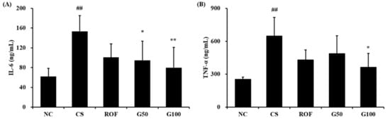 CS group markedly increased inflammatory mediators, including IL-6 and TNF-α, in comparison to NC group (NC group; IL-6: 61.78 ± 16.99 TNF-α: 254.62 ± 17.93, CS group; IL-6: 153.49 ± 31.76 TNF-α: 648.7 ± 168.64, Figure 4A,B, respectively). The roflumilast-treated group had decreased levels of IL-6 and TNF-α compared with those of the CS group (ROF group; IL-6: 100.6 ± 27.3 TNF-α: 429.72 ± 91.55). GGWE-treated groups reduced the levels of IL-6 and TNF-α in comparison to those of CS group (G50 group; IL-6: 94.83 ± 38.73 TNF-α: 487.62 ± 163.05, G100; IL-6: 79.93 ± 40.75 TNF-α: 363.15 ± 126.69). In particular, a high dose in the GGWE-treated group showed a significant reduction compared with those in the CS group.
