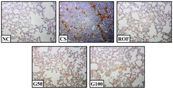 Lung tissues from the CS group showed increased iNOS expression compared to those of the NC group, while iNOS expression was significantly reduced in the ROF group compared to that in the CS group (Figure 5A,B). iNOS expression was also decreased in the GGWE-treated group compared to that in the CS group. These results were consistent with immunohistochemistry results (Figure 6). Consistent with iNOS expression, COX-2 expression increased significantly in the CS group in comparison to that in the NC group (Figure 5A,C). The GGWE-treated groups showed reduced COX-2 expression in comparison to the CS group.