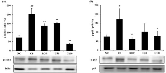 GGWE decreased the phosphorylation of IκBα and NF-κB expression in lung tissue. (A) phosphorylation of IκBα expression and quantitative analysis for phosphorylation of IκBα expression, (B) phosphorylation of NF-κB expression and quantitative analysis for the phosphorylation of NF-κB expression. NC, non-treated mice; CS, CS and LPS exposure mice; ROF, roflumilast 10 mg/kg and CS and LPS exposure mice; G50, GGWE 50 mg/kg and CS and LPS exposure mice; G100, GGWE 100 mg/kg and CS and LPS exposure mice. The values shown are the mean ± SD. ## p < 0.01 vs. NC; # p < 0.05 vs. NC; ** p < 0.01 vs. CS; * p < 0.05 vs. CS.