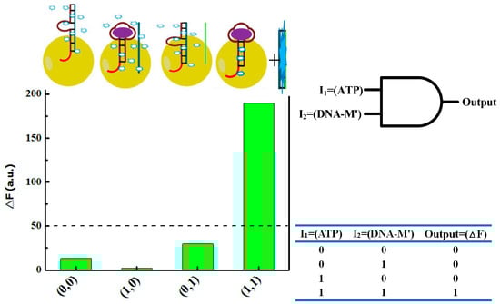 Firstly, we used fluorescence spectroscopy to investigate the feasibility of the proposed assay. The differences between the peaks of the four curves and the peak of the a-curve in Figure 1 were used as the output signal, respectively. If the fluorescence intensity difference, ΔF, was greater than 50 a.u., the output signal was 1, otherwise it was 0. As shown in Figure 1, adsorption of the DNA-T + DNA-M dsDNA with sticky ends on the GNP surface (input 0,0) resulted in a strong quenching of the PicoGreen fluorescence owing to fluorescence resonance energy transfer (FRET) [13]. Upon the individual addition of ATP (1,0) or DNA-M′ ssDNA (0,1), the fluorescence intensity barely changed because the dsDNA remained adsorbed on the GNP surface through the sticky end, resulting in FRET. However, the addition of both ATP and DNA-M′ (1,1) resulted in the binding of ATP to DNA-T ssDNA and the release of DNA-M ssDNA, which subsequently bound to DNA-M′ ssDNA to form DNA-M + DNA-M′ dsDNA, causing an obvious increase in the fluorescence intensity due to binding of the PicoGreen to the DNA-M + DNA-M′ dsDNA. This increase in the PicoGreen fluorescence intensity was induced only by the dual input of ATP and DNA-M′, which conforms to the Boolean calculation of an AND logic gate as shown in Scheme 1.