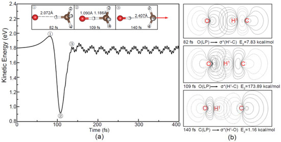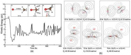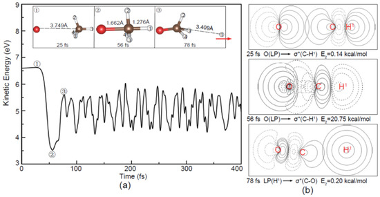 (a) Evolution of the total kinetic energy and snapshots in the reaction beginning with the O− center-of-plane attack (6.6 eV); (b) The corresponding NBO contour maps at the selected times and E2 is the hyperconjugative energy. The red arrow in (a) shows the translational direction of the product H.