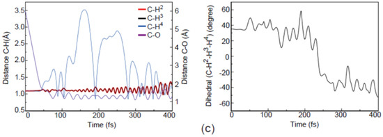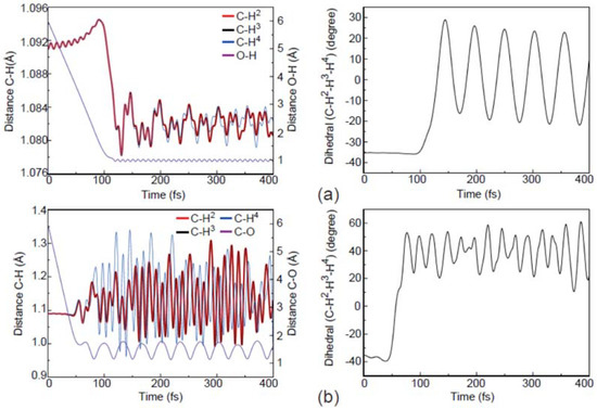 In addition, a few new trajectories leading to the products of OCH3− and H have also been observed. As shown in Figure 9, the dynamic process of reaction (3) is completely different from those observed in Figure 4a and Figure 5a. In this process, an H atom is firstly abstracted to form the slowly rotating OH−. Then, this OH− group is recombined with CH3. Finally, the H atom attached to the O atom is released and the vibrating OCH3− is formed. Therefore, the above phenomena suggest that the reaction (3) is a typical roaming process, which has also been observed in the molecular dynamics of the other systems [39,40,41,42]. Given the fact that no roaming mechanism for reactions (3) has been reported previously, further experimental and theoretical studies are required to confirm this point.