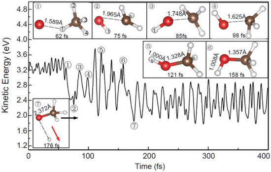 In the center-of-plane and center-of-edge-angle attack processes, as shown in Figure 4 and Figure 5, the O− is directly combined with C atom, leading to the release of H atom in the opposite direction of the O− (Figure 4) and the side H atom (Figure 5), respectively. The charge transfers of LP(O−) → can also be observed in these two cases. Compared with the above apex attack mode in Figure 3, remarkable variations of the total kinetic energy can be observed here, suggesting that the internal energy distributions of the products are different depending on the attack modes.