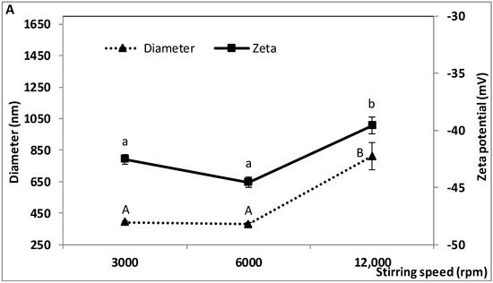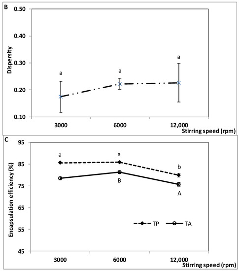 The effect of stirring speed during the second homogenization step before microfluidization was investigated in the range 3000 to 12,000 rpm. Mixing time (15 min) and all the other parameters were kept constant. As shown in Figure 2, the size and zeta potential of the oil droplets and the encapsulation efficiency of TP and TA were significantly affected by stirring speed. The effect on size dispersity was not statistically significant. Droplet size and zeta potential did not vary significantly between 3000 and 6000 rpm but significantly increased at 12,000 rpm (Figure 2A). The corresponding values were 390 ± 11.8, 377 ± 11.5 and 809 ± 86.4 nm for diameter and −42.53 ± 0.42, −44.53 ± 0.47 and −39.57 ± 0.75 mV for zeta potential. Size dispersity ranged from 0.17 ± 0.06 to 0.23 ± 0.07 between 3000 and 12,000 rpm (Figure 2B). The highest values of encapsulation efficiency were obtained at 3000 and 6000 rpm for TP (85.5 ± 0.20 and 85.7 ± 0.29%) and at 6000 rpm for TA (81.2 ± 0.73%) (Figure 2C).