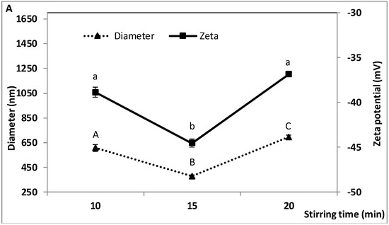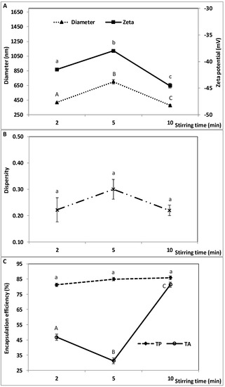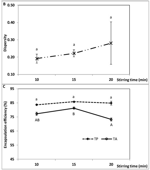 Stirring time during the second homogenization step was varied from 10 to 20 min, while stirring speed (6000 rpm) and all the other parameters were kept constant. As shown in Figure 3, droplet diameter, zeta potential and TA encapsulation efficiency were significantly affected by stirring time. In contrast, size dispersity and TP encapsulation efficiency did not vary significantly. Particle diameter and zeta potential exhibited a V-shaped profile with minimum values (377 ± 11.5 and −44.53 ± 0.47, respectively) when homogenizing for 15 min (Figure 3A). They varied from 607 ± 29.0 to 693 ± 15.8 nm and −38.87 ± 0.55 to −36.87 ± 0.15, respectively, between 10 and 20 min. Size dispersity ranged from 0.19 ± 0.03 to 0.28 ± 0.12 (Figure 3B). TP encapsulation efficiency remained unchanged, ranging from 83.6 ± 0.38 to 85.7 ± 0.29%, while TA encapsulation was greater after 15 min (81.2 ± 0.73%) than after 20 min (73.2 ± 1.02%) (Figure 3C).