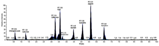 Based on the optimization condition of LC/MS-MS, the MeOH extract of M. styphelioides leaves was subjected to identification and quantification of the polyphenol components, in order to better discuss its biological potential. The detailed phenolic composition was determined using our standard library information (peak retention time, [M − H−] (m2), and LC-MS/MS data). M. styphelioides leaf extract showed the presence of several types of phenols belonging to diverse phenolic families, such as phenolic acids and flavonoids. Fifteen phenolic compounds were identified and quantified, with a range of 3.04–5.61 min retention times (RT) in negative polarity mode (Figure 1 and Table 2). Qualitatively, the phenolic profile included seven phenolic acids (vanillic acid, gallic acid, caffeic acid, syringic acid, chlorogenic acid, ferulic acid, and ellagic acid), nine flavonoids (apigenin, kaempferol, myricetin, naringenin, quercetin, luteolin, pinocembrin, hesperidin, and rutin). In quantitative terms, M. styphelioides polyphenol extract contained a rich source of bioactive phenols, mainly phenolic acids (25%) and flavonoids (70.6%). Most of the detected flavonoids corresponded to quercetin (53.99%) and apigenin (4%), followed by kaempferol (3.2%). The major phenolic acid compound found in metanolic extract was gallic acid (13.5%), followed by ellagic acid (6.3%) and vanillic acid (4.3%).