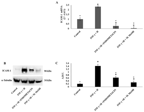 Inter-cellular adhesion molecule-1 (ICAM-1) mRNA expression (A) and protein production (B, and C). ICAM-1 mRNA expression was determined by RT-PCR (A), and ICAM-1 protein production was determined using Western blot (B: representative immunoblot; C: protein expression calculated as Arbitrary Densitometric Units; A.D.U.) in NCTC 2544 72 h after the addition of M. MeOH (50 µg/mL) with INF-γ + H. * Significantly different than control; ° significantly different from INF-γ/H-treated samples (p < 0.05).